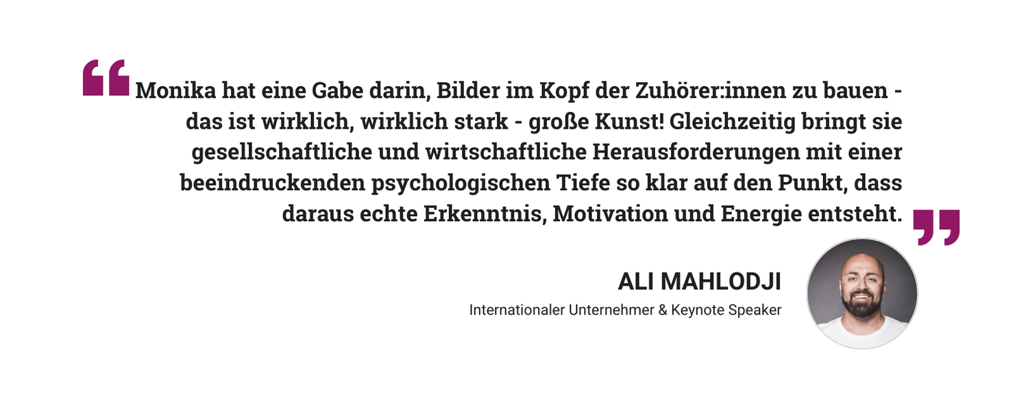 Die Kraft, die in uns liegt: Monika gelingt es in Ihrem Vortrag eindrucksvoll aufzuzeigen, dass auch unter schwierigen Umständen Großes entstehen kann. Mit Ihrer authentischen Art ist sie für unglaublich viele Menschen zu einer echten Mutmacherin geworden. Diese große Botschaft braucht die Welt genau jetzt - offen, mutig und im Vertrauen auf sich selbst in die Zukunft blicken.
